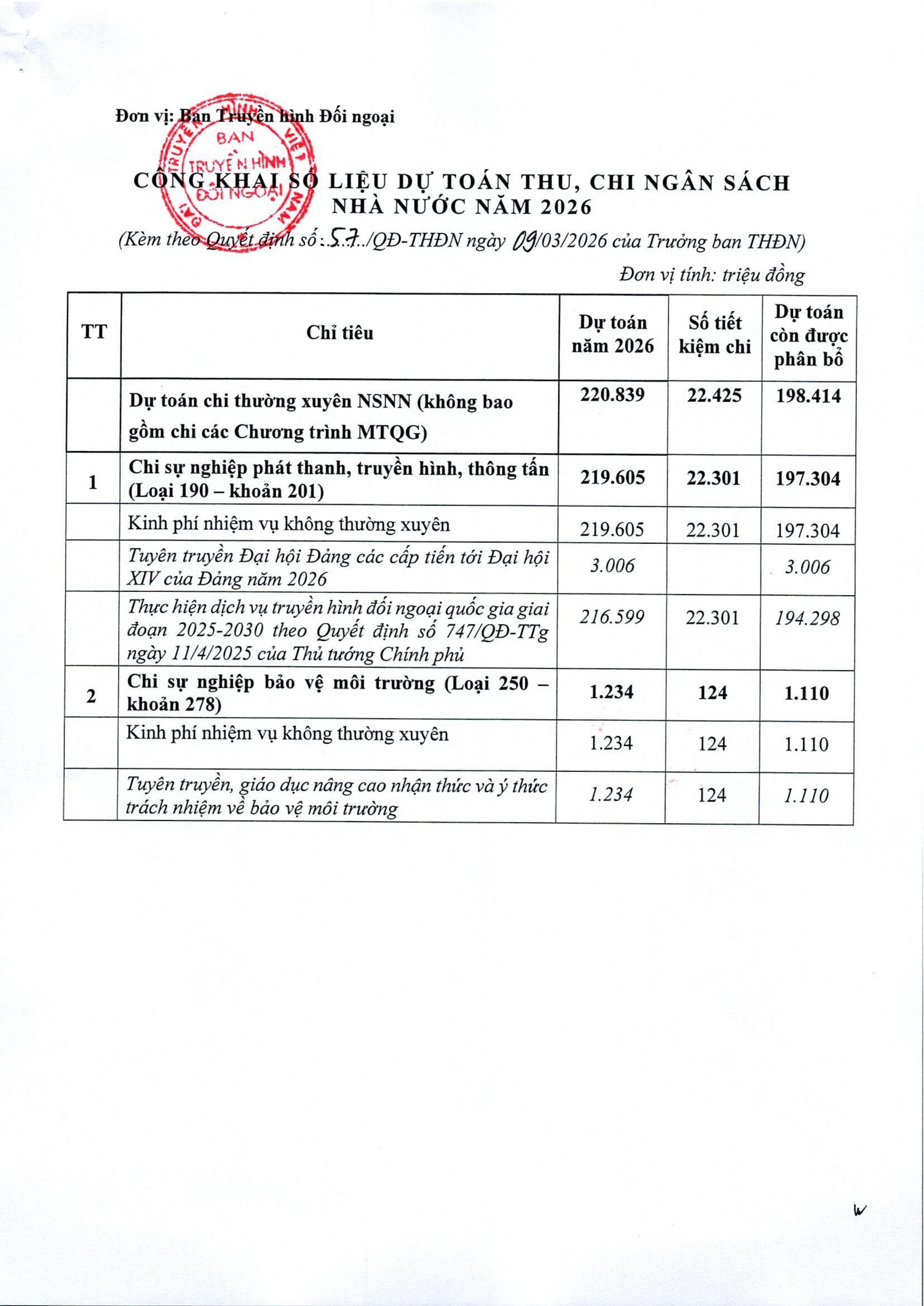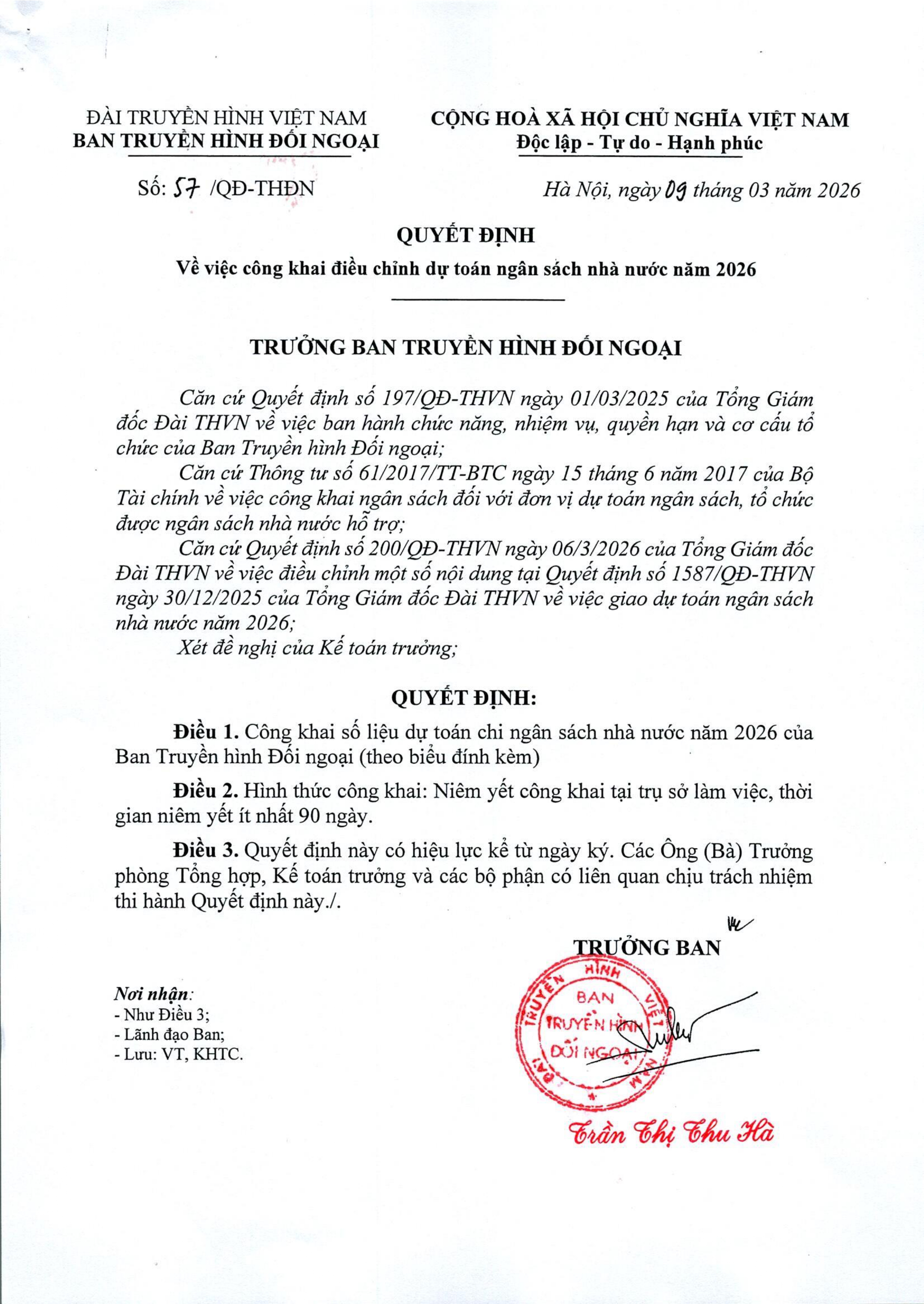 Thực hiện quy định về công khai tài chính vốn đầu tư thuộc ngân sách Nhà nước, VTV4 đăng tải quyết định số 57/QĐ-THĐN của Ban Truyền hình Đối ngoại về việc công khai điều chỉnh dự toán ngân sách nhà nước năm 2026.