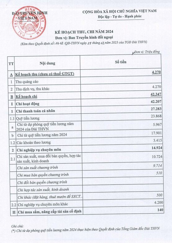 Ban Truyền hình đối ngoại công khai kế hoạch thu,chi và kế hoạch sản xuất chương trình năm 2024 từ nguồn thu của Đài Truyền hình Việt Nam đối với các đơn vị trực thuộc Đài Truyền hình Việt Nam.