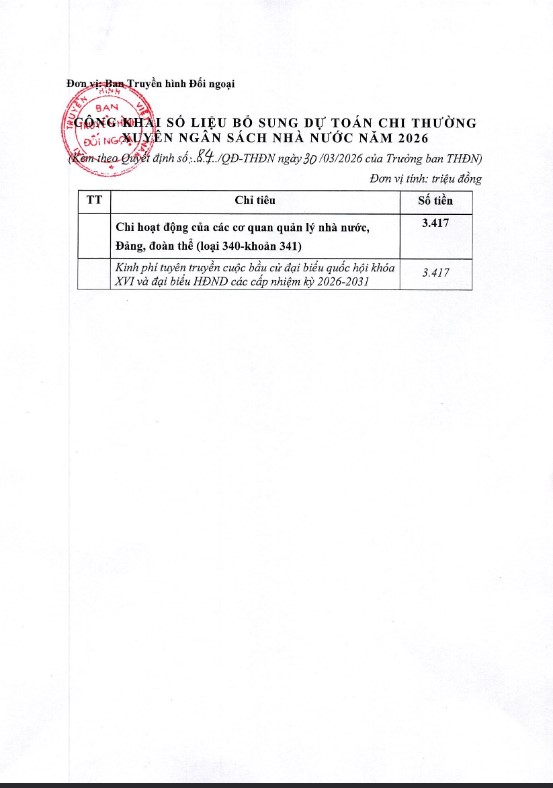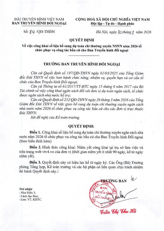 84/QĐ-THVN Về việc công khai số liệu bổ sung dự toán chi phí thường xuyên NSNN năm 2026 tổ chức phục vụ công tác bầu cử cho Ban Truyền hình đối ngoại