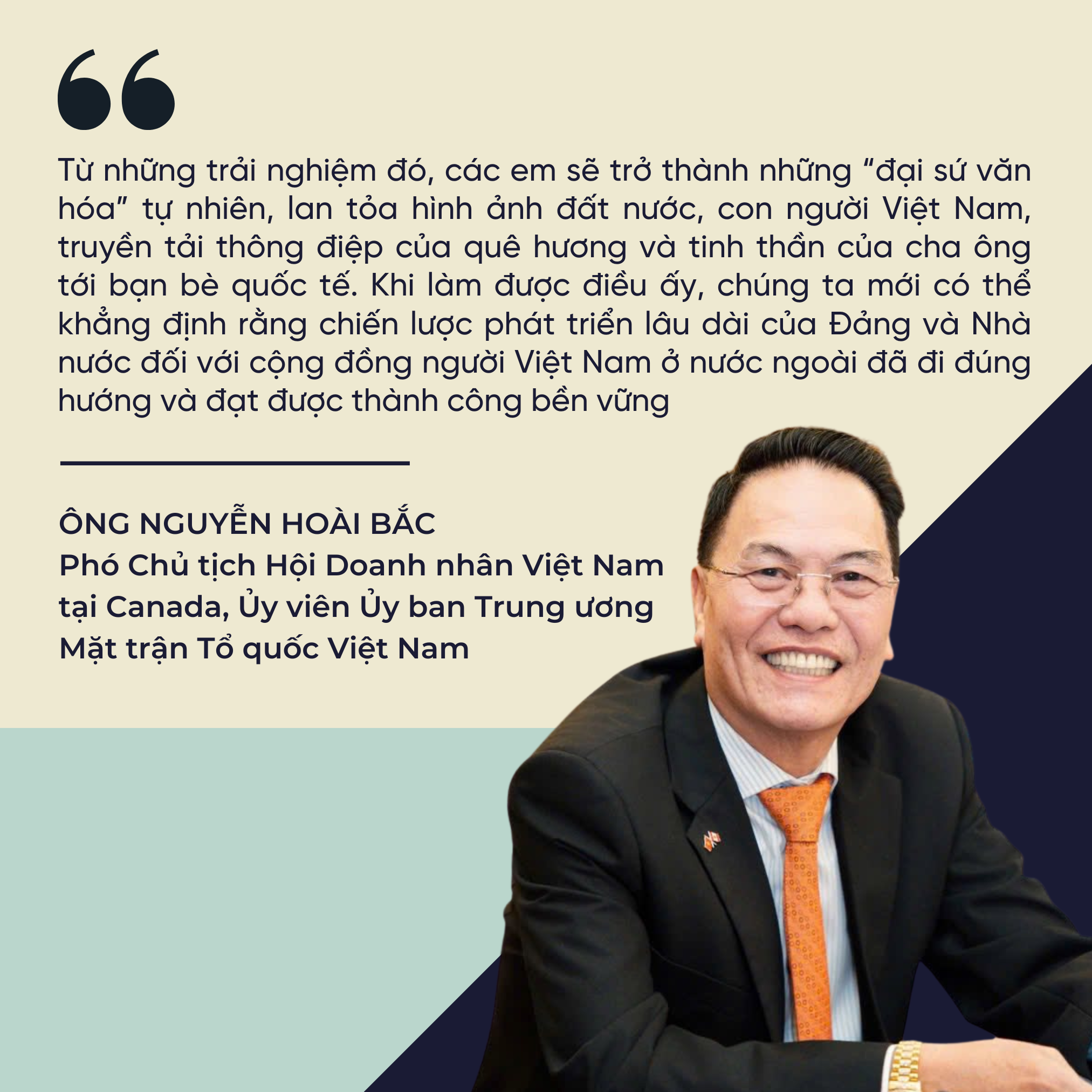 Ông Nguyễn Hoài Bắc nói thêm: “Từ những trải nghiệm đó, các em sẽ trở thành những “đại sứ văn hóa” tự nhiên, lan tỏa hình ảnh đất nước, con người Việt Nam, truyền tải thông điệp của quê hương và tinh thần của cha ông tới bạn bè quốc tế. Khi làm được điều ấy, chúng ta mới có thể khẳng định rằng chiến lược phát triển lâu dài của Đảng và Nhà nước đối với cộng đồng người Việt Nam ở nước ngoài đã đi đúng hướng và đạt được thành công bền vững”.
