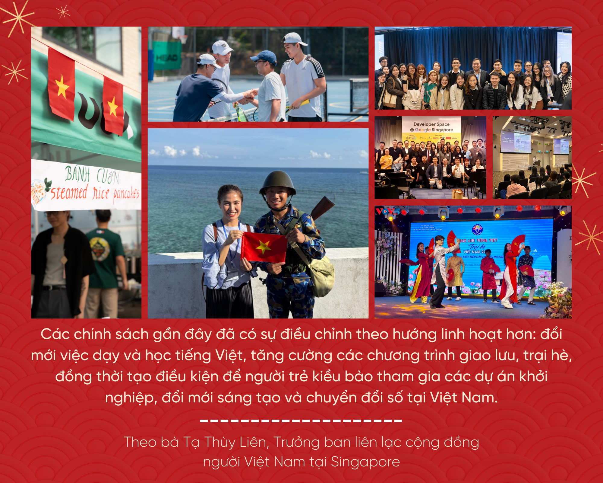 Theo bà Tạ Thùy Liên, các chính sách gần đây đã có sự điều chỉnh theo hướng linh hoạt hơn: đổi mới việc dạy và học tiếng Việt, tăng cường các chương trình giao lưu, trại hè, đồng thời tạo điều kiện để người trẻ kiều bào tham gia các dự án khởi nghiệp, đổi mới sáng tạo và chuyển đổi số tại Việt Nam. Cách tiếp cận cũng dần chuyển từ “kêu gọi trở về” sang “mở rộng không gian gắn kết”, cho phép đóng góp từ xa, theo mạng lưới và theo dự án.