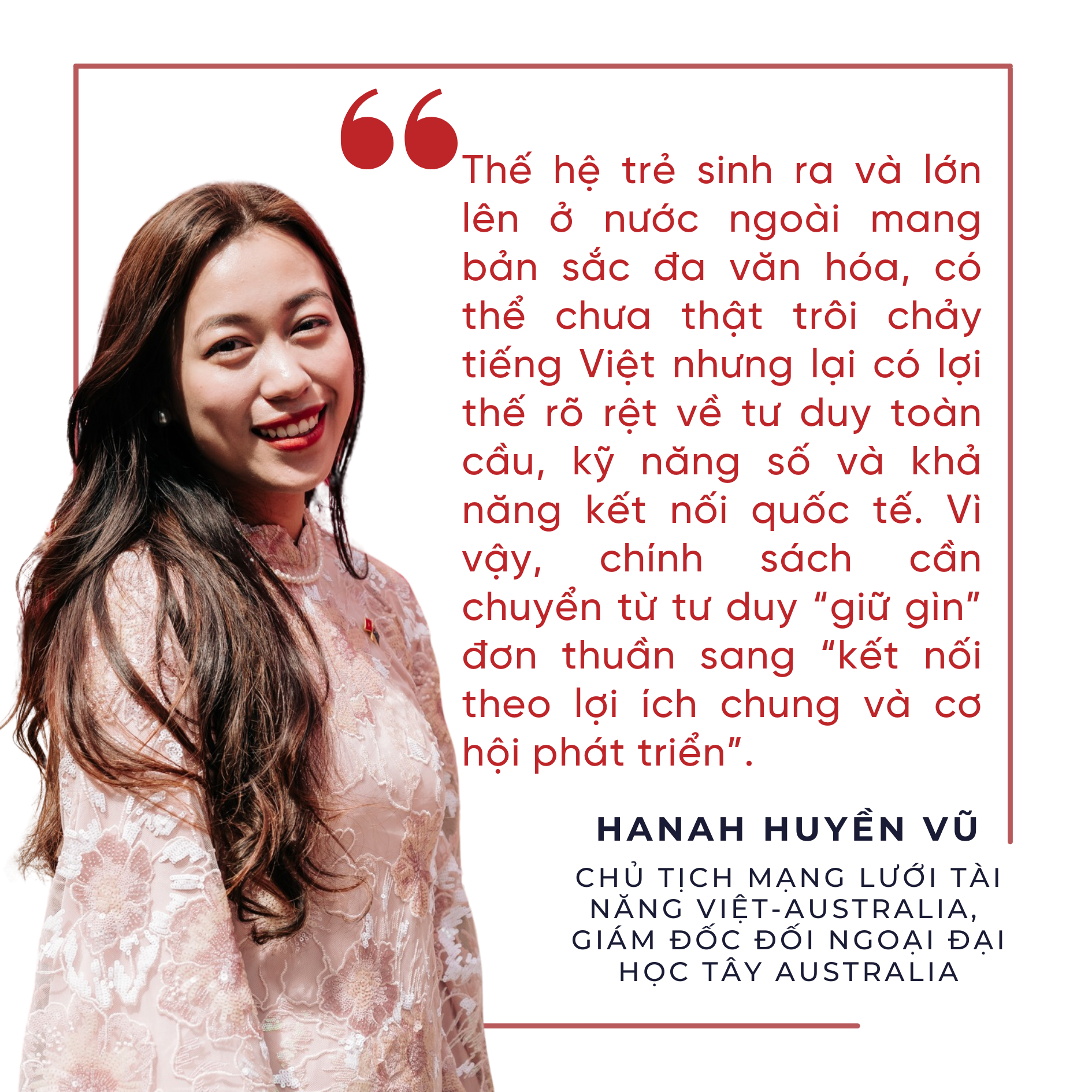 Theo bà Hanah Huyền Vũ, Chủ tịch Mạng lưới Tài năng Việt-Australia, Giám đốc đối ngoại Đại học Tây Australia, thế hệ trẻ sinh ra và lớn lên ở nước ngoài mang bản sắc đa văn hóa, có thể chưa thật trôi chảy tiếng Việt nhưng lại có lợi thế rõ rệt về tư duy toàn cầu, kỹ năng số và khả năng kết nối quốc tế. Vì vậy, chính sách cần chuyển từ tư duy “giữ gìn” đơn thuần sang “kết nối theo lợi ích chung và cơ hội phát triển”.