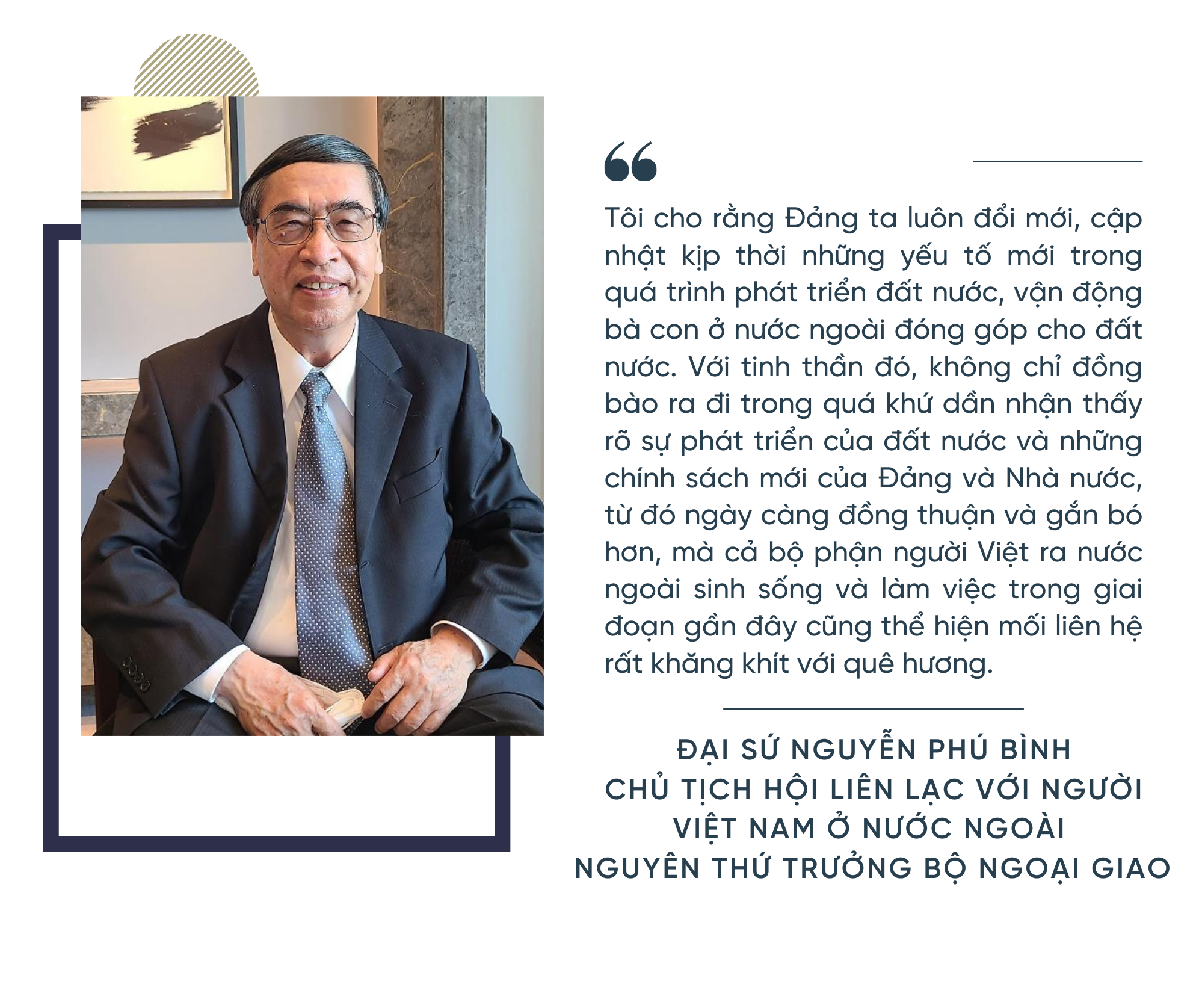 “Tôi cho rằng Đảng ta luôn đổi mới, cập nhật kịp thời những yếu tố mới trong quá trình phát triển đất nước, vận động bà con ở nước ngoài đóng góp cho đất nước. Với tinh thần đó, không chỉ đồng bào ra đi trong quá khứ dần nhận thấy rõ sự phát triển của đất nước và những chính sách mới của Đảng và Nhà nước, từ đó ngày càng đồng thuận và gắn bó hơn, mà cả bộ phận người Việt ra nước ngoài sinh sống và làm việc trong giai đoạn gần đây cũng thể hiện mối liên hệ rất khăng khít với quê hương. Dù có sinh sống ở bất kỳ đâu, họ đều có thể đóng góp cho Tổ quốc theo cách này hay cách khác. Thậm chí, lực lượng kiều bào trẻ ngày nay đang trở thành cầu nối để các cộng đồng Việt kiều ở nước ngoài gắn bó nhiều hơn với đất nước”, Đại sứ Nguyễn Phú Bình nói.